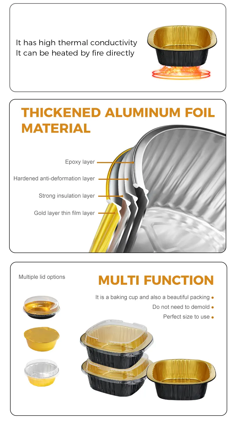 युंचू एल्युमीनियम फ़ॉइल सप्लायर के डिस्पोजेबल बाइनॉरल स्क्वायर बॉक्स ब्लैक गोल्ड लाइट-दीवार वाले एल्यूमीनियम फ़ॉइल कंटेनर खाद्य-ग्रेड 8011 एल्यूमीनियम मिश्र धातु फ़ॉइल से बने होते हैं। सतह पर घनी ऑक्साइड परत बनाने के लिए उन्हें उच्च तापमान एनीलिंग और स्टरलाइज़ेशन प्रक्रियाओं से उपचारित किया गया है। उनमें कोई भारी धातु नहीं है और कोई गंध नहीं है। वे सभी प्रकार के भोजन के सीधे संपर्क में रह सकते हैं और उच्च तापमान पर हानिकारक पदार्थों की वर्षा को रोक सकते हैं। चाहे उनका उपयोग गर्म व्यंजन, ठंडे व्यंजन, मिठाई या सॉस रखने के लिए किया जाता है, वे खाद्य सुरक्षा की रक्षा कर सकते हैं और एफडीए और एसजीएस जैसे कई सुरक्षा प्रमाणपत्रों का अनुपालन कर सकते हैं, जिससे हर भोजन अधिक सुरक्षित हो जाता है। अद्वितीय काले सोने की रोशनी वाली दीवार का डिज़ाइन पारंपरिक एल्यूमीनियम फ़ॉइल कंटेनरों की नीरस बनावट को तोड़ता है। मैट ब्लैक गोल्ड कोटिंग और चिकनी दीवार की सतह एक उच्च स्तरीय भावना लाती है। न केवल इसकी उत्कृष्ट उपस्थिति है, यह प्रकाश और ऑक्सीजन को प्रभावी ढंग से अवरुद्ध कर सकता है, भोजन के ऑक्सीकरण में देरी कर सकता है, भोजन की सुगंध और नमी को मजबूती से रोक सकता है, गंध हस्तांतरण से बचा सकता है, और भोजन के मूल स्वाद को लंबे समय तक बनाए रख सकता है। चिकनी दीवार की सतह पर कोई खांचे या झुर्रियाँ नहीं हैं, जिससे इसमें बैक्टीरिया पनपने की संभावना कम होती है और इसे साफ करना आसान होता है। यह मुद्रण अनुकूलन को बेहतर ढंग से अनुकूलित कर सकता है, जिससे खानपान ब्रांडों को उनकी पहचान और गुणवत्ता बढ़ाने में मदद मिलती है।