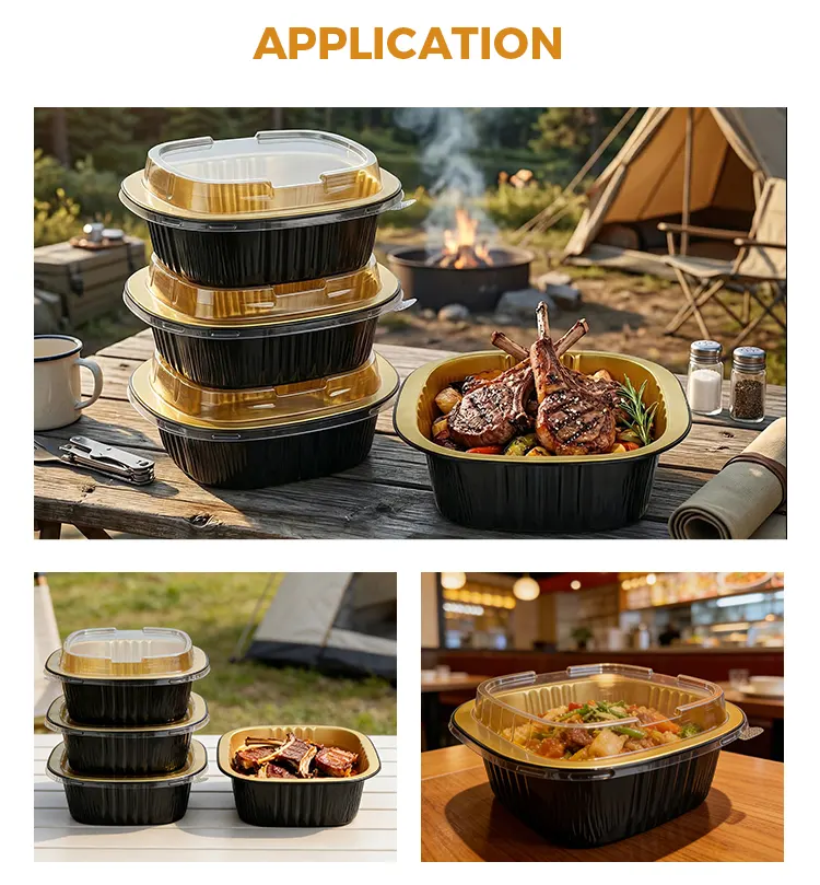 • डिस्पोजेबल बाइनॉरल स्क्वायर बॉक्स ब्लैक गोल्ड एल्युमिनियम फॉयल कंटेनरडिस्पोजेबल बाइनॉरल स्क्वायर बॉक्स ब्लैक गोल्ड एल्युमिनियम फॉयल कंटेनर