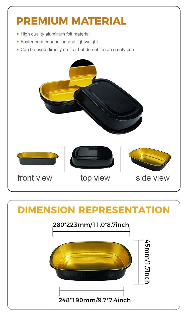 Yunchu एल्यूमीनियम पन्नी आपूर्तिकर्ता डिस्पोजेबल ब्लैक गोल्ड कैटरिंग आयताकार एल्यूमीनियम फ़ॉइल कंटेनर बड़े-वॉल्यूम कैटरिंग और टेकअवे उद्योगों के लिए उपयुक्त है, विशेष रूप से बेकिंग, कैटरिंग चेन और सेल्फ-सर्विस चेन और अन्य परिदृश्यों के लिए उपयुक्त है, उत्पाद 8011 फूड-ग्रेड एल्यूमिनम फ़ॉइल मटेरियल से बना है। जगह, एल्यूमीनियम पन्नी सीलिंग ढक्कन और पीईटी पूरी तरह से पारदर्शी ढक्कन के साथ उत्कृष्ट सीलिंग प्रदर्शन, उच्च तापमान प्रतिरोध और तेल और रिसाव रोकथाम समारोह के साथ इस्तेमाल किया जा सकता है। इसका व्यापक रूप से विभिन्न परिदृश्यों जैसे कि खाद्य पैकेजिंग, हीटिंग, प्रशीतन और टेकअवे डिलीवरी जैसे विभिन्न परिदृश्यों में उपयोग किया जाता है। सतह एक हल्के दीवार डिजाइन को अपनाती है, एक सपाट और चिकनी उपस्थिति के साथ, जो गर्मी-सील वाली फिल्म की स्वचालित सीलिंग के लिए सुविधाजनक है, जिससे पैकेजिंग दक्षता में सुधार होता है।
