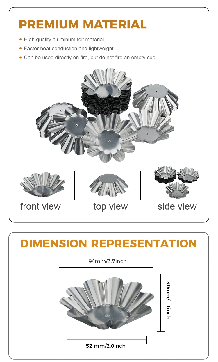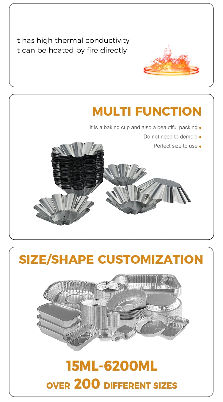 आउटडोर और सुविधाजनक दृश्य: हल्का और पोर्टेबल, आउटडोर कैंपिंग, पिकनिक, पार्टियों और अन्य दृश्यों के लिए उपयुक्त। अंडे के टार्ट और स्नैक्स पहले से तैयार किए जा सकते हैं और बिना भारी बेकिंग शीट के कंटेनर में रखे जा सकते हैं। इन्हें खाने के बाद सीधे फेंक दिया जा सकता है। इसे साफ करना आसान है और यह जगह नहीं लेता। इसका उपयोग टेकआउट पैकेजिंग के लिए भी किया जा सकता है। एल्यूमीनियम पन्नी सामग्री की सीलिंग और गर्मी संरक्षण गुण प्रभावी ढंग से डेसर्ट के तापमान और स्वाद को बनाए रख सकते हैं और परिवहन के दौरान रिसाव और विरूपण से बच सकते हैं।