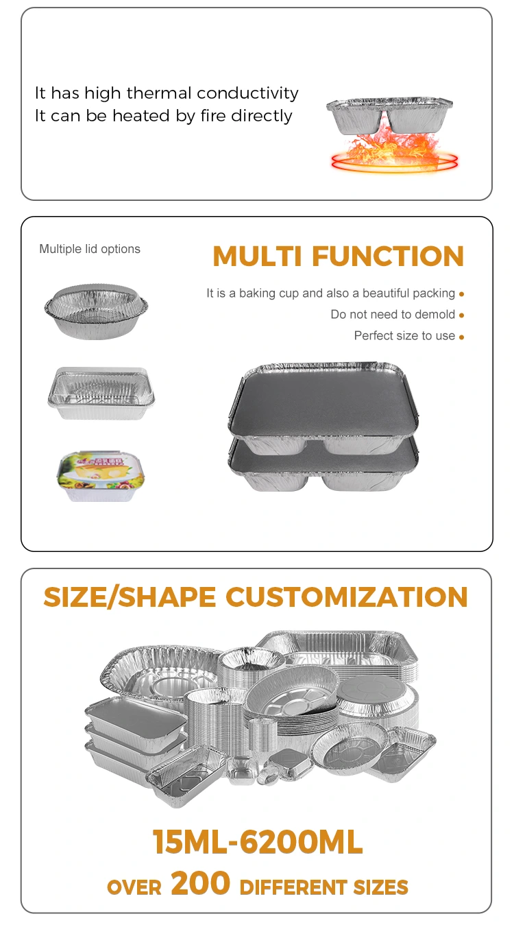 डिस्पोजेबल कम्पार्टमेंट फास्ट फूड सिल्वर एल्यूमीनियम पन्नी कंटेनरों के साथ पेपर लिड के साथ अच्छी गर्मी प्रतिधारण है और भोजन की गर्मी के नुकसान को धीमा कर सकता है। शरद ऋतु और सर्दियों में, यह गर्म भोजन के संरक्षण पर एक अच्छा प्रभाव पड़ता है, जैसे कि ताजा रूप से निर्मित गर्म स्टू इसमें डाल दिया जाता है, जो भोजन के तापमान को एक निश्चित अवधि के लिए बनाए रख सकता है, ताकि उपभोक्ता भोजन करते समय गर्म भोजन का आनंद ले सकें।