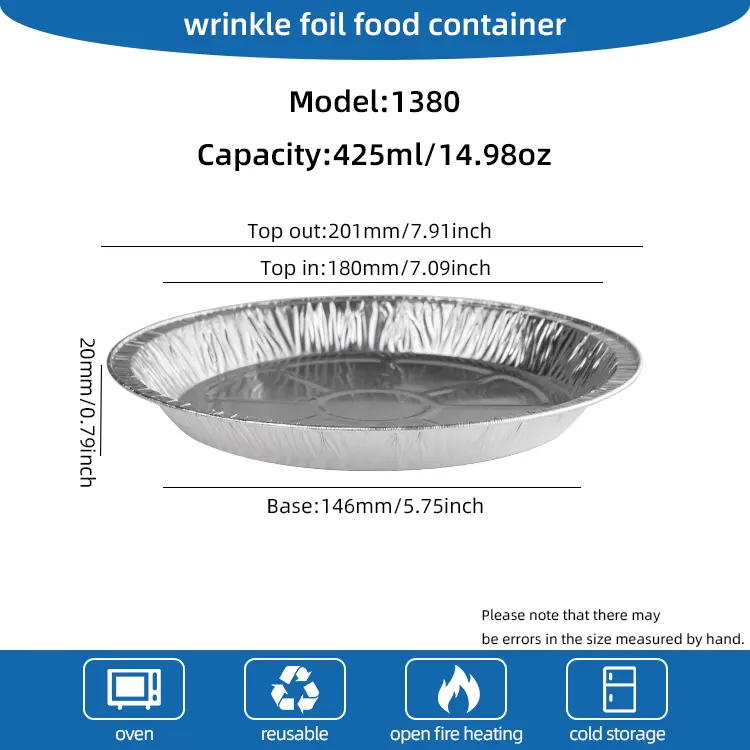 यूंचू एल्युमिनियम फॉयल डिस्पोजेबल डिस्क एयर फ्रायर सिल्वर एल्युमिनियम फॉयल कंटेनर स्वच्छ और पर्यावरण के अनुकूल दोनों है। यह गाढ़े और संक्षारण प्रतिरोधी सामग्रियों से बना है जो आसानी से विकृत नहीं होते हैं और भोजन के सीधे संपर्क में आ सकते हैं। यह उच्च तापमान से डरता नहीं है, जलता नहीं है, जलता नहीं है और डंप करना आसान नहीं है। यह 250 डिग्री सेल्सियस तक उच्च तापमान का सामना कर सकता है और खाना पकाने के विभिन्न तरीकों जैसे उच्च तापमान बेकिंग, ओवन और बारबेक्यू के लिए उपयुक्त है, इसलिए चिंता करने की कोई आवश्यकता नहीं है। विभिन्न आकारों की विविध बेकिंग आवश्यकताओं को पूरा करने के लिए कई विशिष्टताएँ उपलब्ध हैं, जिससे आप विभिन्न खाद्य उत्पादन आवश्यकताओं को आसानी से पूरा कर सकते हैं।