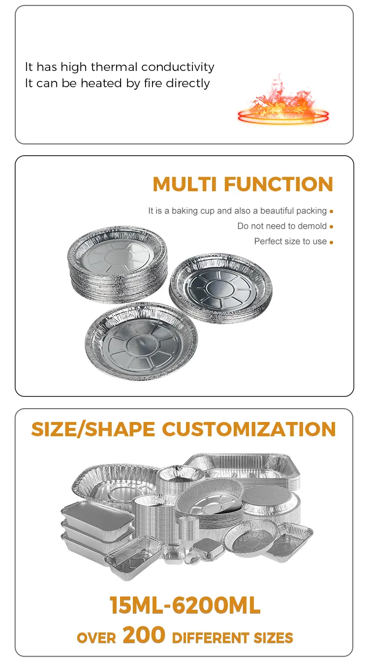 गाढ़ा और उन्नत एल्यूमीनियम फ़ॉइल सामग्री अधिक स्थायित्व प्रदान करती है! सामान्य पतली एल्यूमीनियम फ़ॉइल प्लेटों की तुलना में, यह उत्पाद एक उन्नत गाढ़ा करने की प्रक्रिया को अपनाता है। सामग्री ठोस है और ख़राब होना या टूटना आसान नहीं है। यह -20°C से 250°C तक उच्च और निम्न तापमान को आसानी से सहन कर सकता है। यह एयर फ्रायर, ओवन और अन्य रसोई के बर्तनों के लिए उपयुक्त है। उच्च तापमान पर बेकिंग के दौरान यह आकार में स्थिर रहता है और ढहता या लीक नहीं होता है। यहां तक ​​कि चावल के नूडल्स को सूप या रिच स्टू के साथ ग्रिल करते समय भी, रस को मजबूती से बंद किया जा सकता है ताकि तेल को बहने से रोका जा सके और फ्रायर के भीतरी बर्तन पर दाग लगने से बचाया जा सके;