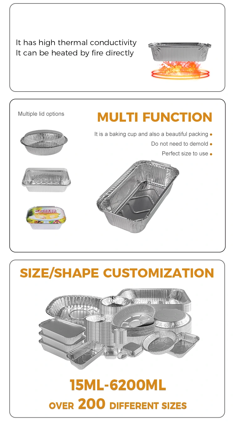 यंचू एल्यूमीनियम पन्नी आपूर्तिकर्ता से डिस्पोजेबल आयताकार बेकिंग सिल्वर एल्यूमीनियम पन्नी कंटेनर एक बहुमुखी रसोई उपकरण है जो विभिन्न खाना पकाने के तरीकों जैसे कि ग्रिलिंग, हॉट पॉट, ग्रैटिन, टेकवे पैकेजिंग, और बहुत कुछ के लिए उपयुक्त है। यह कंटेनर विभिन्न प्रकार के बर्तनों और उपकरणों को फिट करने के लिए पर्याप्त कॉम्पैक्ट है, और विभिन्न खुले लौ बारबेक्यू की जरूरतों को पूरा करने के लिए विभिन्न आकारों में आता है। इसका उपयोग विभिन्न खाद्य उत्पादों को बनाने के लिए किया जा सकता है, जैसे कि एयर फ्रायर और अन्य उपकरण अनुप्रयोग, गर्मी और तेल प्रतिरोध, आसान बेकिंग।