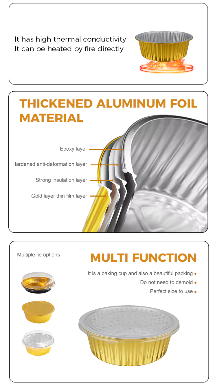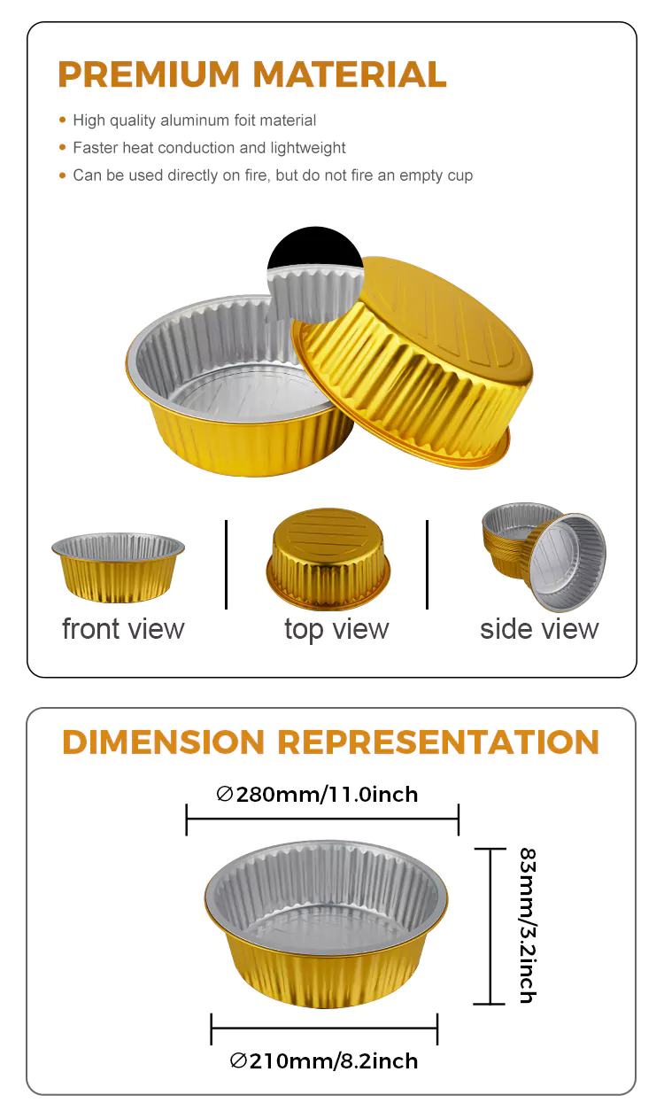 युंचू एल्युमीनियम फॉयल के डिस्पोजेबल राउंड बड़ी क्षमता वाले गोल्ड एल्युमीनियम फॉयल कंटेनर सटीक रोलिंग और वन-पीस बनाने की प्रक्रिया के माध्यम से खाद्य-ग्रेड 8011 एल्यूमीनियम मिश्र धातु बेस सामग्री से बने होते हैं। कंटेनर की बाहरी दीवार चिकनी है और सीधे भोजन से सुरक्षित रूप से संपर्क कर सकती है। अम्लीय या तैलीय खाद्य पदार्थ रखने पर भी, यह सामग्री की स्थिरता बनाए रख सकता है और कोई गंध अवशेष नहीं छोड़ सकता है।