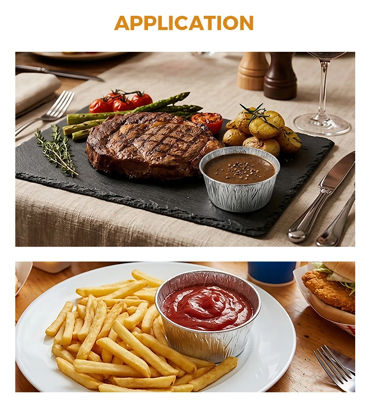 • डिस्पोजेबल राउंड सॉस सिल्वर एल्युमिनियम फॉयल खाद्य कंटेनरडिस्पोजेबल राउंड सॉस सिल्वर एल्युमिनियम फॉयल खाद्य कंटेनर