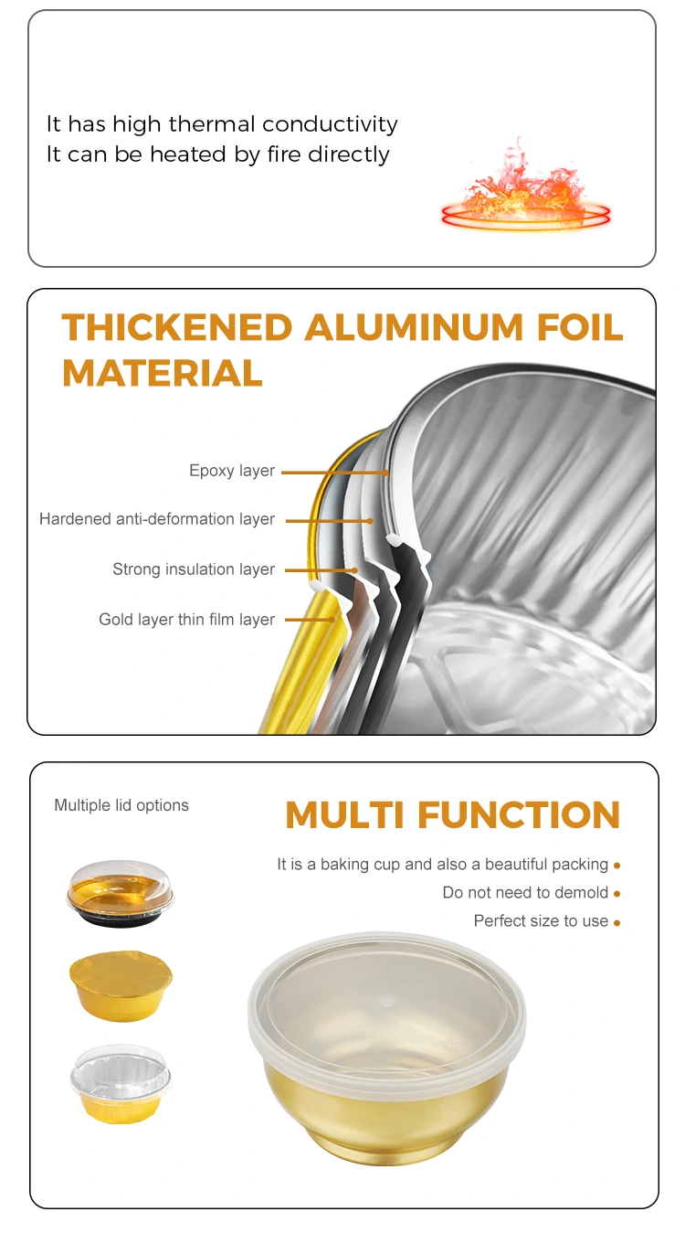 युन्चू एल्यूमीनियम फ़ॉइल आपूर्तिकर्ता, डिस्पोजेबल गोल छोटे सोने का कटोरा एल्यूमीनियम फ़ॉइल कंटेनर, गाढ़ा एल्यूमीनियम फ़ॉइल, उच्च कठोरता, आसानी से विकृत नहीं, रिसाव के बिना सील किया जा सकता है, मजबूत गर्मी प्रतिरोध, पुन: प्रयोज्य, एक मोल्ड और पैकेजिंग दोनों के रूप में काम करता है, उच्च तापमान नसबंदी एल्यूमीनियम फ़ॉइल पैकेजिंग सुरक्षित, स्वच्छ है, और इसमें अच्छे थर्मल इन्सुलेशन गुण हैं - मजबूत गर्मी प्रतिरोध - भाप में पकाया जा सकता है, प्रशीतित, जमे हुए, और पुन: प्रयोज्य है। फूड-ग्रेड पीई इनर मेम्ब्रेन, फूड-ग्रेड पीई इनर मेम्ब्रेन के साथ जोड़ी गई धातु सामग्री, रंगहीन और गंधहीन मोटी जार बॉडी छोटे जार को आसानी से विकृत नहीं करती है, अच्छी सुरक्षा, मजबूत सीलिंग सुरक्षा और विश्वसनीयता प्रदान करती है, बोतल का ढक्कन कसकर बोतल बॉडी के साथ जुड़ जाता है, मजबूत सीलिंग लंबे समय तक उत्पाद की ताजगी बनाए रखती है, पूरी तरह से नई सामग्री जो सुरक्षित, पर्यावरण के अनुकूल और गंधहीन होती है। डिस्पोजेबल गोल छोटे सोने के कटोरे एल्यूमीनियम फ़ॉइल कंटेनरों का व्यापक रूप से विभिन्न खाद्य उद्योगों जैसे खाद्य कारखानों, कैंडी कारखानों, सूखे फल कारखानों, बेकरी, विशेष खाद्य भंडार और सूखे फल छँटाई स्टोर आदि में उपयोग किया जाता है। इनका उपयोग भोजन, कैंडी, शहद, सूखे प्लम, सूखे फल, पुराने कीनू के छिलके, ठोस, तरल और ठोस सार रखने के लिए किया जाता है।
