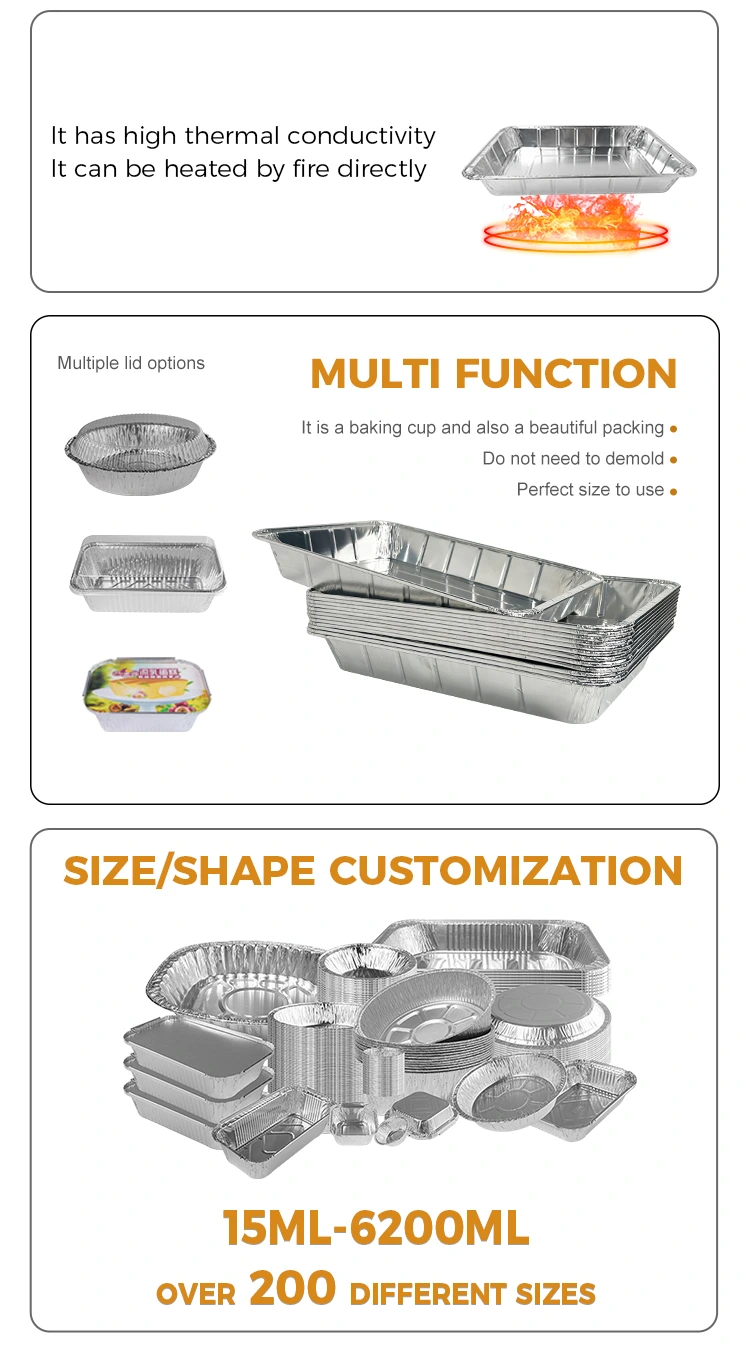 Yunchu एल्यूमीनियम पन्नी आपूर्तिकर्ता बड़े ग्रील्ड फिश टेकअवे सिल्वर एल्यूमीनियम पन्नी कंटेनर, विभिन्न प्रकार की खाना पकाने की जरूरतों को पूरा करता है, विभिन्न अवसरों जैसे कि एयर फ्राइर्स, बारबेक्यू ग्रिल, रोटिसरी ओवन और समुद्री भोजन बनाने के लिए उपयुक्त है। यह एल्यूमीनियम पन्नी कंटेनर विशेष रूप से एक उठे हुए किनारे के साथ डिज़ाइन किया गया है ताकि भोजन को प्रभावी ढंग से पॉट की दीवार से चिपकाने और चिपकाने से रोका जा सके, और कई परतों के साथ पैन लाइनर की रक्षा करता है, जो व्यावहारिक और चिंता-मुक्त है। यह खाद्य-ग्रेड 8011-0 सामग्री से बना है, जिसमें 520 डिग्री सेल्सियस तक गर्मी प्रतिरोधी तापमान है, झुलसाया या टूटा हुआ नहीं है, और गाढ़ा सामग्री इसे विकृत करने में आसान नहीं है। एल्यूमीनियम पन्नी बॉक्स को एक पूरे के रूप में गाढ़ा किया जाता है, इसलिए आप उपयोग के दौरान विरूपण के बारे में चिंता किए बिना खाना पकाने के बाद आसानी से इसे उठा सकते हैं। हेम्ड डिज़ाइन इसे पकड़ने के लिए आरामदायक बनाता है और किनारों को गोल किया जाता है, इसलिए आपको अपनी उंगलियों को खरोंचने के बारे में चिंता करने की ज़रूरत नहीं है। चिकनी किनारों को पीईटी पूरी तरह से पारदर्शी लिड्स और एल्यूमीनियम पन्नी पन्नी लिड्स द्वारा पूरक किया जाता है, जिससे वे विभिन्न प्रकार के खाना पकाने के तरीकों के लिए अधिक उपयुक्त हो जाते हैं।