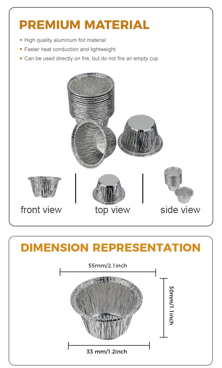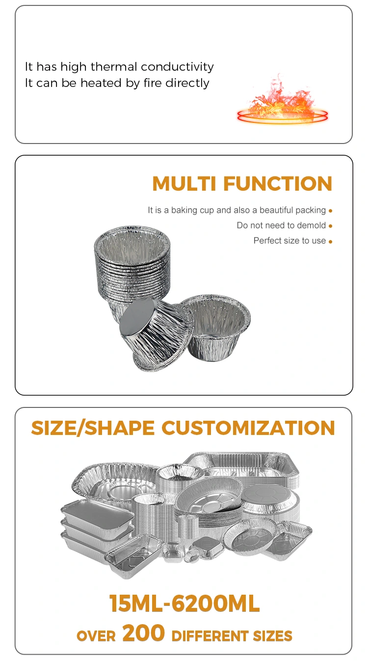 घरेलू ओवन अनुप्रयोगों के लिए, आप मिनी केक और स्वस्थ बेक्ड पुडिंग बनाने के लिए एल्यूमीनियम फ़ॉइल कप का उपयोग कर सकते हैं जिन्हें आपके बच्चे खाना पसंद करते हैं। बेकिंग ट्रे को साफ करने की कोई जरूरत नहीं है और भोजन के बाद इसे साफ करना आसान है।