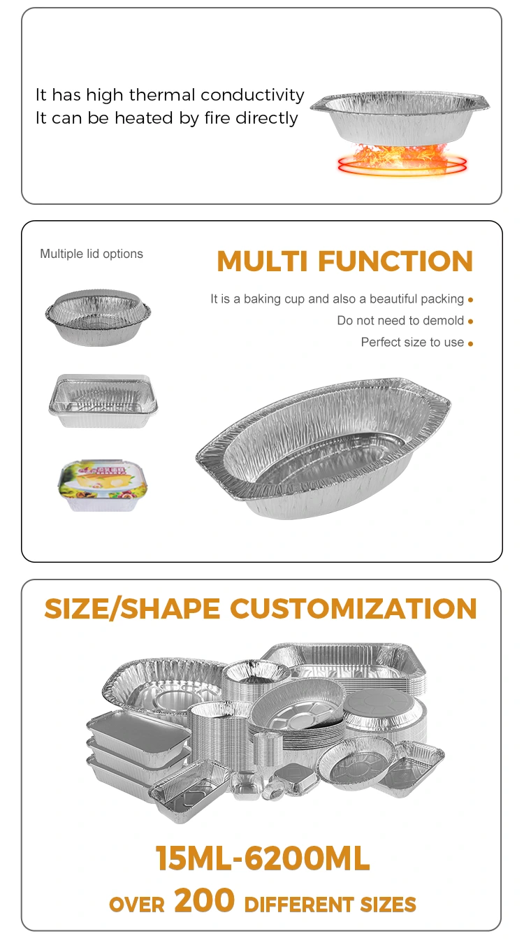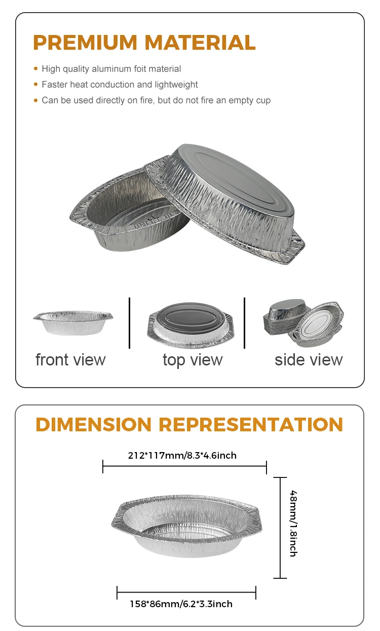 Yunchu एल्यूमीनियम पन्नी अंडाकार बेक्ड ब्रेड सिल्वर एल्यूमीनियम पन्नी कंटेनरों का उपयोग सीधे ओवन या ग्रिल में किया जा सकता है, जो बहुत सुविधाजनक है। केवल 5.9 ग्राम वजन, यह बड़े करीने से ढेर करना आसान है, प्रभावी रूप से परिवहन, रेस्तरां चढ़ाना और रसोई के लिए जगह की बचत करना। उत्पाद की हल्की दीवार प्रक्रिया सतह को चिकनी और सुव्यवस्थित बनाती है, और चांदी की उज्ज्वल उपस्थिति न केवल सुंदर और सुरुचिपूर्ण है, बल्कि बड़े सुपरमार्केट के लिए लेबल और स्कैन करने के लिए सुविधाजनक है।