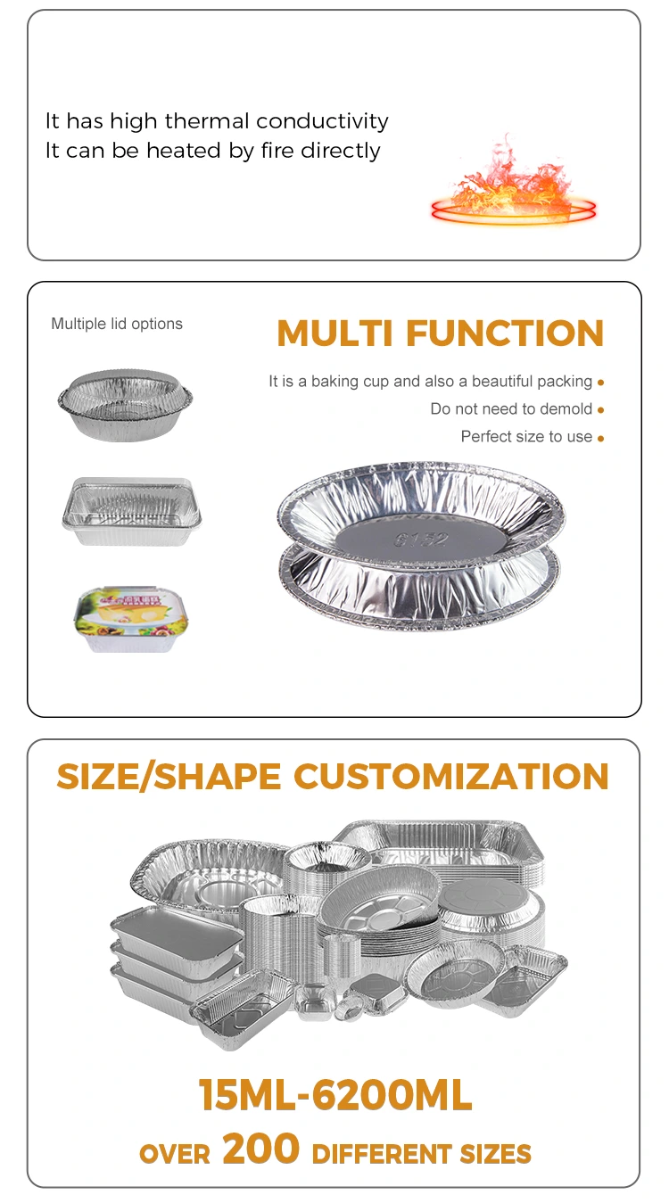 विशेषताएं: एक-टुकड़ा मोल्डिंग गाढ़ा और बेक्ड-रेसिस्टेंट, फूड कॉन्टैक्ट ग्रेड एल्यूमीनियम पन्नी सामग्री को अपनाना, भोजन से संपर्क करने का आश्वासन दिया गया, डिफॉर्म करने में आसान नहीं और लीक नहीं, मजबूत मोटाई, जंग प्रतिरोध, उच्च तापमान प्रतिरोध।