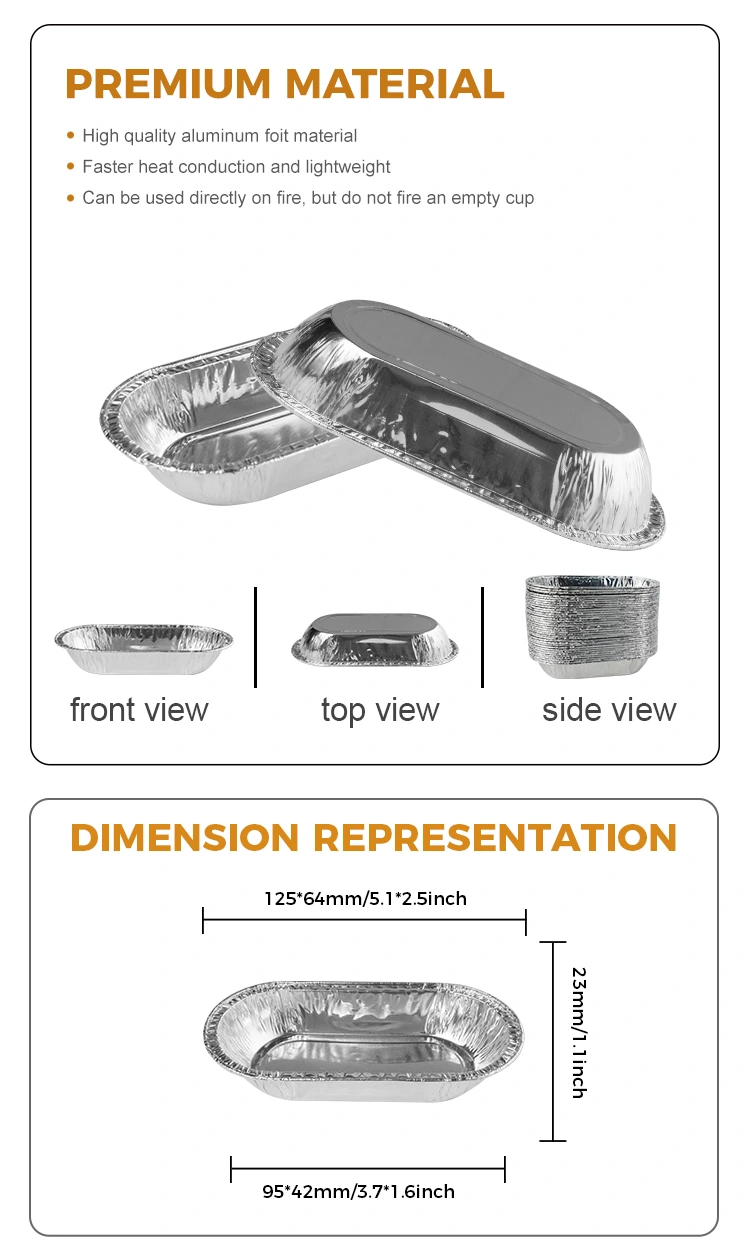 यंचू ओवल बेकिंग सिल्वर पन्नी फूड कंटेनर एक बहुत ही मामूली आकार है, जिसमें 125*64 मिमी (5.1*2.5 इंच) का शीर्ष व्यास, 95*42 मिमी (3.7*1.6 इंच) का आधार व्यास, केवल 23 मिमी (1.1 इंच) की ऊंचाई, और 105 मील (3.7 ओजेड) की क्षमता है। यह आकार न केवल ले जाने के लिए आसान है, बल्कि विभिन्न प्रकार की उपयोग की जरूरतों को भी पूरा कर सकता है।