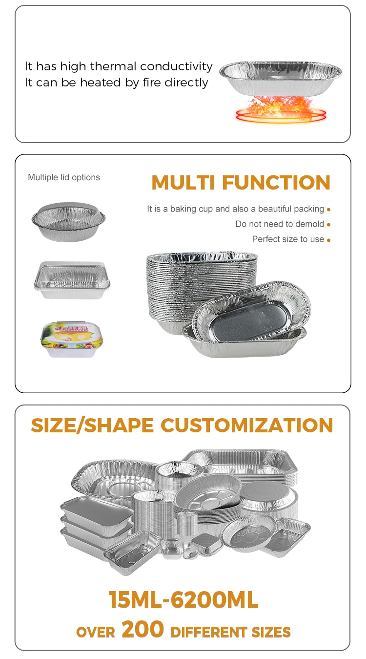 ओवल रोस्ट सिल्वर एल्यूमीनियम पन्नी फूड कंटेनर 6005 खानपान, टेकवे डिलीवरी प्लेटफॉर्म, बड़े भोज, बुफे और अन्य अवसरों के लिए उपयुक्त है, और इसका उपयोग छोटे केक, बिस्कुट, चॉकलेट, सॉस और अन्य खाद्य पदार्थों को रखने के लिए किया जा सकता है। चाहे वह विभिन्न प्रकार के सॉस के साथ जोड़ा गया हो या पके हुए डेसर्ट के लिए गार्निश के रूप में, यह कॉम्पैक्ट पन्नी बॉक्स आपके डिश के लिए एक बढ़िया अतिरिक्त है। हल्के और टिकाऊ, कंटेनर उच्च गुणवत्ता वाले एल्यूमीनियम पन्नी से बना होता है और शीर्ष पर एक कस्टम पारदर्शी पालतू ढक्कन होता है और भोजन को बेकिंग शीट से चिपकाने से रोकने के लिए नीचे की तरफ एक निश्चित ढक्कन होता है, जिससे रिलीज और साफ करना आसान हो जाता है, साथ ही परिवहन और उपयोग करने में आसान होता है।