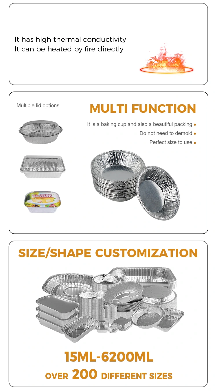 स्नैक्स सिल्वर एल्यूमीनियम पन्नी फूड कंटेनर, यूनिफ़ॉर्म हीट कंडक्शन, जलाने में आसान नहीं, यहां तक ​​कि हीटिंग, स्वादिष्ट और सुरक्षित भी। ऑयल-प्रूफ और एंटी-फाउलिंग, डिमोल्ड करने में आसान, आसपास के झुर्रियों वाले आकार का उपयोग करना आसान है, नीचे की सतह गोल और चिकनी है, एक-क्लिक त्वरित डिमोल्डिंग, और यह उपयोग के बाद खो जाता है, साफ करने की कोई आवश्यकता नहीं है। कई लार्ज-कैपेसिटी डिज़ाइन, एक बार का उपयोग, श्रम से साफ करने की आवश्यकता नहीं है, व्यापक रूप से उपयोग किया जाता है, इसका उपयोग पके हुए अंडे के टार्ट्स, केक, अंडे की जर्दी क्रिस्प्स, बाउल केक और अन्य व्यंजनों के लिए किया जा सकता है।