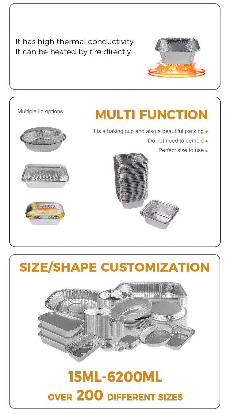 स्क्वायर एयर फ्रायर सिल्वर एल्यूमीनियम पन्नी कंटेनर उच्च गुणवत्ता वाले एल्यूमीनियम पन्नी सामग्री का उपयोग करता है, जो हल्के और टिकाऊ दोनों है। शीर्ष को एक पालतू पारदर्शी ढक्कन के साथ अनुकूलित किया जा सकता है, और नीचे एक ढक्कन होता है जिसे भोजन को बेकिंग शीट से चिपके रहने से रोकने के लिए बॉक्स में निचोड़ा जाता है और तय किया जाता है, जो जारी करना और साफ करना आसान है, और परिवहन और उपयोग करने में आसान है।