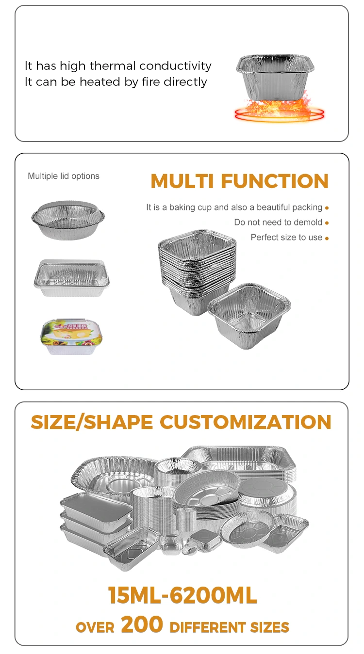 Yunchu एल्यूमीनियम पन्नी आपूर्तिकर्ता द्वारा प्रदान किया गया वर्ग बेकिंग पैन एयर फ्रायर सिल्वर फ़ॉइल कंटेनर विभिन्न प्रकार के अवसरों के लिए उपयुक्त है, जिसमें एयर फ्रायर, छोटे बेकिंग ओवन, कैटरिंग टेकअवे और कैफेटेरिया शामिल हैं। यह न केवल सीप वर्मिसेली, मिठाई लाल बीन्स, ग्रिल्ड चिकन पंख और उबले हुए केक बनाने के लिए उपयुक्त है, बल्कि विभिन्न प्रकार की सामग्री के साथ भी जोड़ा जा सकता है, और यह व्यापक रूप से खानपान उद्योग के सभी पहलुओं में उपयोग किया जाता है। कंटेनर में एक नॉन-स्टिक और एंटी-स्टिक डिज़ाइन है, जिसमें अवतल और उत्तल नीचे की संरचना है जो भोजन के लिए मोल्ड को छोड़ने और एक बेहतर उपस्थिति बनाए रखने के लिए आसान बनाता है। चाहे वह एक खुली लौ पर ग्रिलिंग हो या स्टीमिंग हो, आप इसे आसानी से प्रतिबंधित किए बिना संभाल सकते हैं। इसकी सामग्री मजबूत और टिकाऊ है, जिससे यह न केवल ओवन और एयर फ्रायर में उपयोग के लिए उपयुक्त है, बल्कि खुली लौ ग्रिल या स्टीमर में भी है, जो सुविधाजनक और तेज है। इसके अलावा, कंटेनर की सतह चिकनी और सपाट होती है, और किनारों को गोल किया जाता है और हाथों को खरोंचने के लिए आसान नहीं होता है, और यहां तक ​​कि अगर सिलवटों के होते हैं, तो यह पकड़ को प्रभावित नहीं करेगा। हम आपकी विविध आवश्यकताओं को पूरा करने के लिए, वर्ग, गोल और दिल के आकार की शैलियों सहित विभिन्न प्रकार के पैन आकृतियों की पेशकश करते हैं। यदि आप रुचि रखते हैं, तो कृपया अधिक जानकारी के लिए हमारे ग्राहक सेवा कर्मचारियों से परामर्श करने के लिए स्वतंत्र महसूस करें।