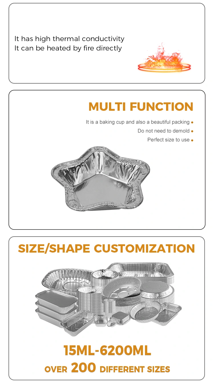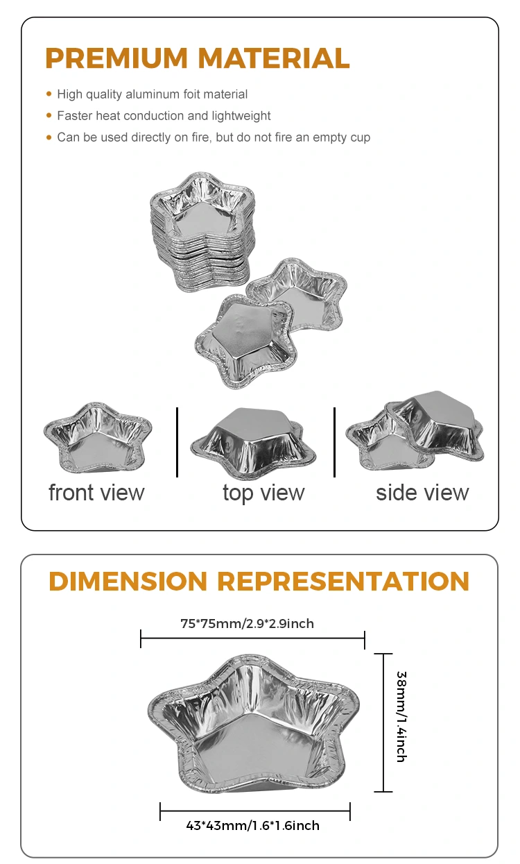 तारे के आकार के एल्यूमीनियम फ़ॉइल टार्ट कप सिल्वर एल्यूमीनियम फ़ॉइल से बने होते हैं और इनमें उच्च तापमान प्रतिरोध होता है, जो -20°C और 300°C के बीच स्थिर रहता है। वे बेकिंग और एयर फ्रायर के उपयोग के लिए उपयुक्त हैं, और उपकरण की आंतरिक दीवारों को नुकसान से बचा सकते हैं। वे डिस्पोजेबल हैं, जिससे वे सुविधाजनक हो जाते हैं क्योंकि किसी सफाई की आवश्यकता नहीं होती है।